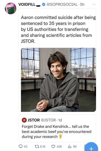 But a guy hacks a university network and downloads a hoard of scientific articles that should have been freely accessible to begin with and he gets 35 years in prison. I’ll admit I wasn’t familiar with this case before I saw this picture. Which is kind of insane in and of itself.