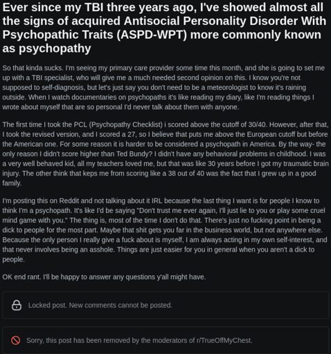 minus-squarejubilationtcornpone@sh.itjust.workslinkfedilinkarrow-up5·22 days agoTraumatic Brain Injury