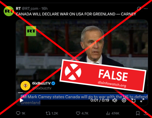 A Twitter/X post on Russian state platform RT, twists Canadian PM Mark Carney’s remarks about supporting Danish/Greenland sovereignty within NATO into a false war declaration. Multiple independent records show Carney did not threaten war; he affirmed that Greenland’s future is for Denmark/Greenland to decide and underscored allied defense commitments—nothing more. Given RT’s track record and EU sanctions, this is a textbook Kremlin tactical narrative injection to create panic and divide the US and Canada.