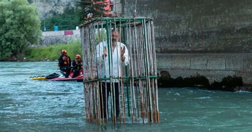 How many influencers can we throw into this boiling pit of acid before the ph balances? Let’s find out. Cutback with rotation reveals Mrbeast dangling upside down from a crane.