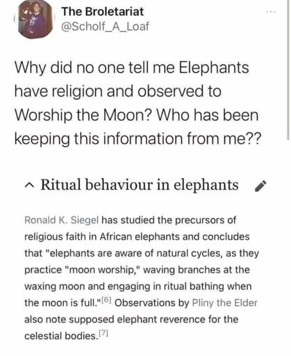 one cannot ignore the elaborate burying behaviour of elephants as a similar sign of ritualistic or even religious behaviour in that species. When encountering dead animals, elephants will often bury them with mud, earth and leaves. Animals known to have been buried by elephants include rhinos, buffalos, cows, calves, and even humans, in addition to elephants themselves. Elephants have [been] observed burying their dead with large quantities of food, fruit, flowers and colourful foliage.[15][clarification needed]