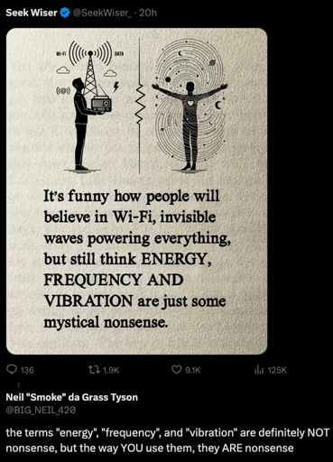 You cannot do this with magic woo woo nonsense that equivocates and conflates terms across different domain specific meanings, and then attempts to build a world view out of confused, meaningless/contradictory gibberish.