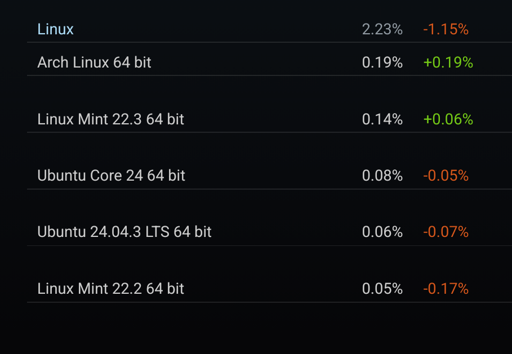 - For the Arch-based distros, e.g. Steam OS Holo (+23.83%) or Arch Linux (+9.07%), the “change” is exactly the value of the current “percentage”, so the percentage of the compared value is 0. So I guess they have new entries in the data without the history of the old entries? Is there any explanation for that?