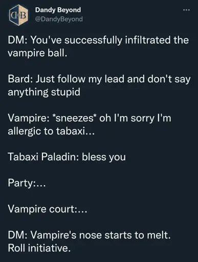Stamets@lemmy.dbzer0.com to RPGMemes @ttrpg.network · 2 months agoDon't say anything stupidlemmy.dbzer0.comimagemessage-square5linkfedilinkarrow-up1341arrow-down12