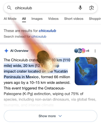 “If you google Chicxulub (the dinosaur killing space rock), the AI summary burns a gallon of gas, contributing to making the planet uninhabitable, helping to create your very own mass extinction event”