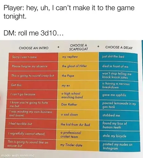 Dazharion@lemmy.dbzer0.com to RPGMemes @ttrpg.network · 5 days agoCan't make it? Finelemmy.dbzer0.comimagemessage-square31linkfedilinkarrow-up1309arrow-down12