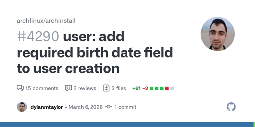 it’s so strange to me that he tried to add age verification scripting changes in archinstall. isn’t that the wrong place systemd makes sense but I’m puzzled by the archinstall pr
