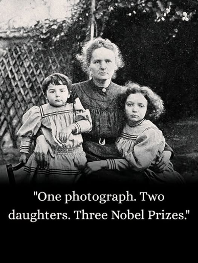 In this quiet moment captured in the early 1900s, Marie Curie sits with her daughters, Irène and Ève. It’s a tender scene—a mother with her children. But behind this gentle photograph lies a story of brilliance that would echo across generations. Marie had already made history. She was the first woman to win a Nobel Prize, and later became the only person ever to win Nobel Prizes in two different sciences. But her greatest legacy might not have been her discoveries. It might have been what she passed down. Irène, the elder daughter, grew up in her mother’s laboratory. She watched Marie measure, test, question, and discover. She saw what passion and precision could unlock. That example took root deeply. Years later, Irène and her husband Frédéric Joliot-Curie discovered artificial radioactivity—a breakthrough that transformed our understanding of atomic physics. In 1935, they won the Nobel Prize in Chemistry. Their work became the foundation for nuclear medicine and energy, carrying forward the scientific torch Marie had lit. Ève, the younger daughter, chose something completely different. Gifted in music and language, she became a concert pianist, then a writer and journalist. After Marie died in 1934, Ève wrote “Madame Curie”—a biography that introduced millions worldwide to her mother’s quiet strength and revolutionary discoveries. During World War II, while her sister worked in laboratories, Ève traveled as a war correspondent, documenting humanity’s darkest and finest hours. Later, she devoted herself to humanitarian work with UNICEF, advocating for children across the globe.