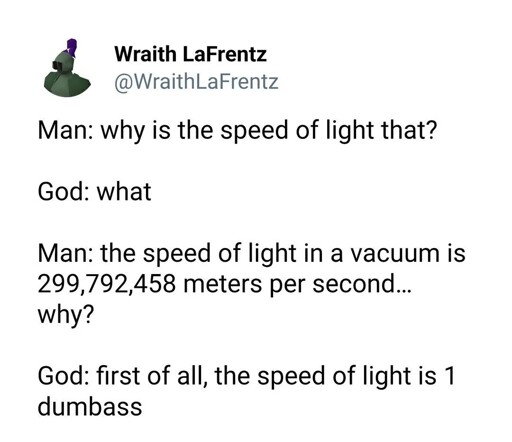 What? Light doesn’t have speed, speed would imply some sort of relative movement that would require something like 3 spatial dimensions but even then everything would move at the same “speed” if you add up the dimensions the real question is why are you moving through space? And that gets into causality and a bunch of other God stuff you wouldn’t be interested in.