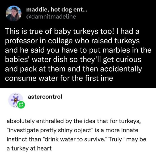 Wild turkeys teach their young, through demonstration, how to forage, and avoid dangers. For a domesticated turkey poult the human takes the role of the parent & teacher. To top it off the wild turkey hasn’t lost its instincts through selective breeding like the domesticated turkey.