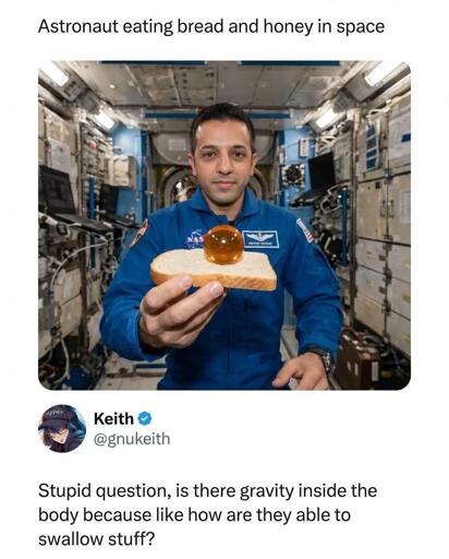 This was legitimately a significant concern that early space programs had. Like, how well would people be able to swallow in free fall, would certain kinds of food cause problems? The food experiments during the Gemini program are pretty interesting