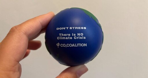 A table overflowed with displays reading “CO2 is a lifesaver,” pamphlets titled “Fossil fuels are the greenest energy source” and “Challenging ‘net zero’ with science,” and children’s books falsely claiming the acceleration of sea level rise is insignificant. Baskets held buttons proclaiming “Unashamed about my carbon footprint,” as well as stress balls resembling tiny Earths that read: “Don’t stress. There is no climate crisis.”