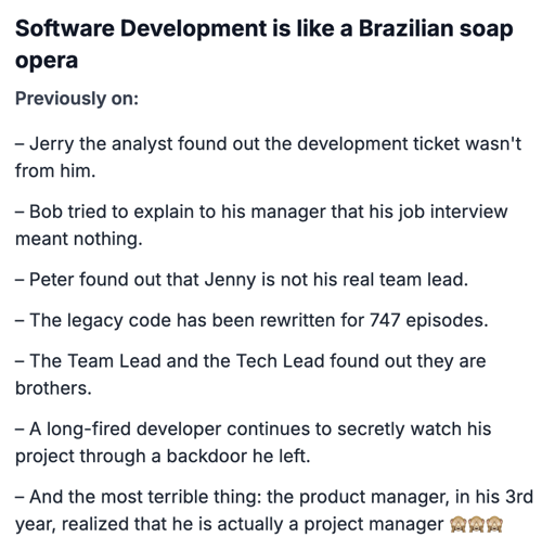 arrow-up174arrow-down1imageSoftware Development is like a Brazilian soap operalemmy.ml☆ Yσɠƚԋσʂ ☆@lemmy.ml to Programmer Humor@lemmy.mlEnglish · 13 days agomessage-square4linkfedilinkcross-posted to: funny@sh.itjust.works