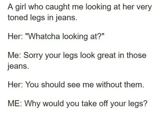minus-squareZapados@sh.itjust.workslinkfedilinkEnglisharrow-up5·5 days agoWho wouldn’t want to take off thier legs? You could fit through small spaces like an air vent.