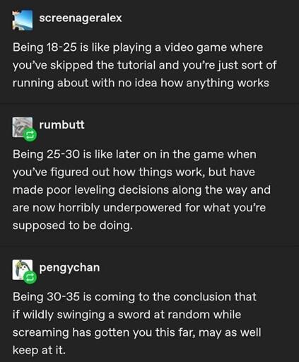 I followed the tutorial so 18-25 was easy mode. 26-35 was a blur mostly making money for other people. 36-40 was realizing the tutorial was a goddamn lie, going to therapy, trying to make up for missed experiences, and balancing work with reward. Now in the 41-45 phase and wondering what it will look like when I reflect back on it in a few years.