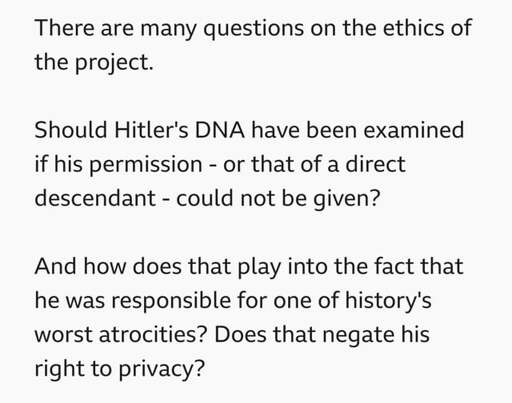 I don’t think this is about “is evil genetic.” The first psragraph of the article states it’s about his underlying health conditions. Which I think is absolutely worth studying, if it means spotting the early warning signs and intervening before another person ends up like Hitler.