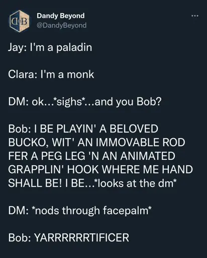 To balance it out, you make them keep the accent up. Let them go answer the door for the pizza delivery. Listen as they have to declare “This be fine booty, me crew eats well this night. No mutiny be had. Take your coin, kingsdog, and may the brine not take ye!”