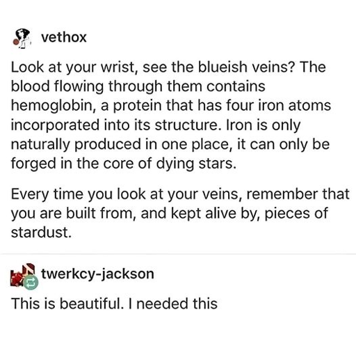Shit, dude. My iron was at 2 after my last blood test. They keep pumping me full of star stuff–pow, straight in the veins–and I just keep burning through it. Why, stars, why! Why does thou forsake me! I am very tired, stars.
