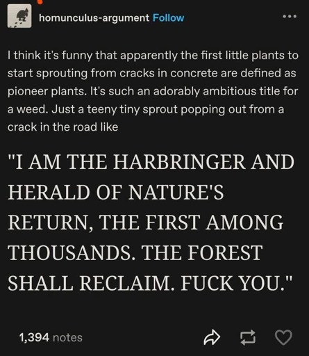 Track_Shovel@slrpnk.net to Science Memes@mander.xyzEnglish · 4 months agoPioneer speciesslrpnk.netimagemessage-square11linkfedilinkarrow-up1359arrow-down16file-text