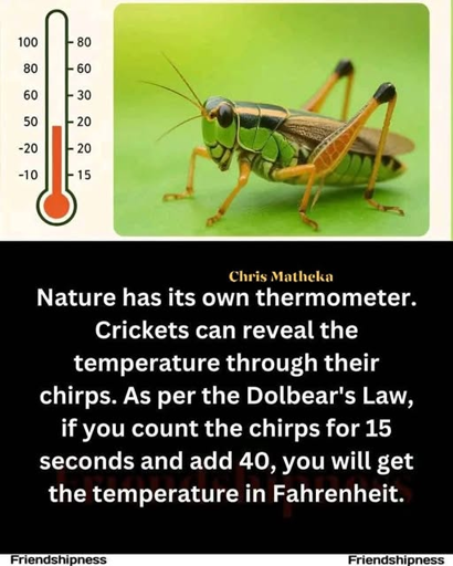 Yes, I am a bitch but that is neither here nor there, but I can clearly hear a wave pattern with the chirps as I sit outside on my front porch, and I already knew about this cool way to measure the temperature in Fahrenheit… (I didn’t remember the number you had to add) ……obviously, we already know whether we are too hot or too cold without knowing the exact temperature though… it’s just a fun factoid when you’re camping