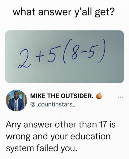 I don’t know how we’ve managed to get to 2025 and there’s still apparently people who haven’t seen a thousand shit PEMDAS posts already