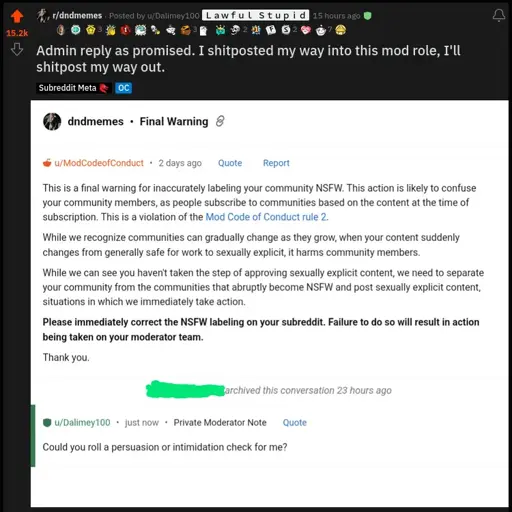 u/Dalimey (who appropriately identifies as “LAWFUL STUPID” shared a warning from reddit admins issuing their final warning against making the sub NSFW (despite the fact that the users of the sub are in full support). They promised to reply to it with “roll for persuasion or intimidation” if they got 10k upvotes, and here is the result. Outstanding move.