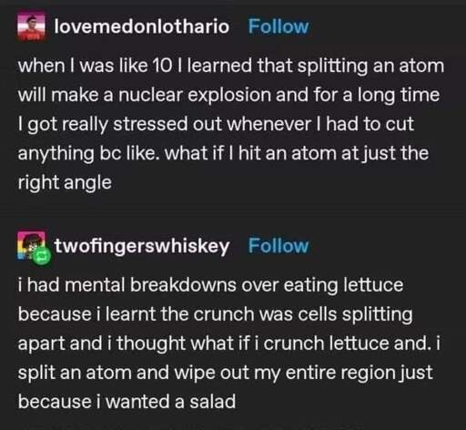 If I’m to believe that second person didn’t misspeak, they had “mental breakdowns” with an “s”, so multiple breakdowns, over the thought that their eating lettuce could cause a nuclear apocalypse.