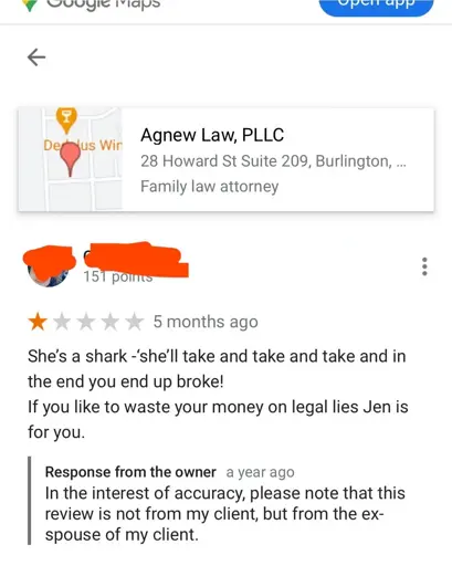 I reworded Agnew’s response because I misread it as if a client used es ex-spouse’s account to write the review [in es behalf], and not that the losing ex-spouse wrote this scathing review.