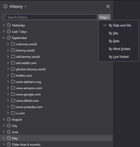 i_have_no_enemies@lemmy.world to Technology@lemmy.worldEnglish · 1 year agoPeople who use firefox, how do you see what website you visit on a specific date? (say on September 12) for me it just shows like thislemmy.worldimagemessage-square1linkfedilinkarrow-up10arrow-down10