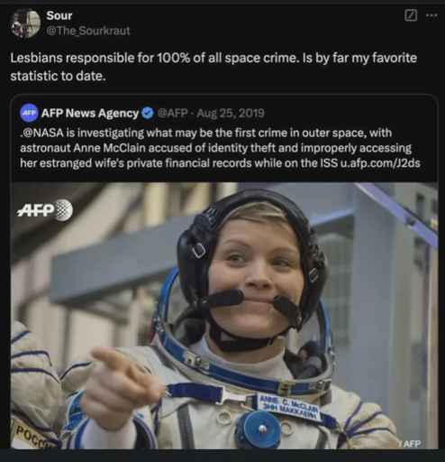 “lesbians are accused in 100% of space crimes” is a much less fun statistic.