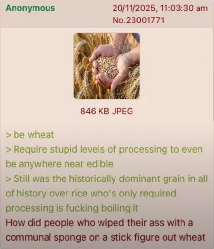 Wheat is just fancy grass. People learned how to process wheat before they learned how to wipe their asses with a communal sponge on a stick.