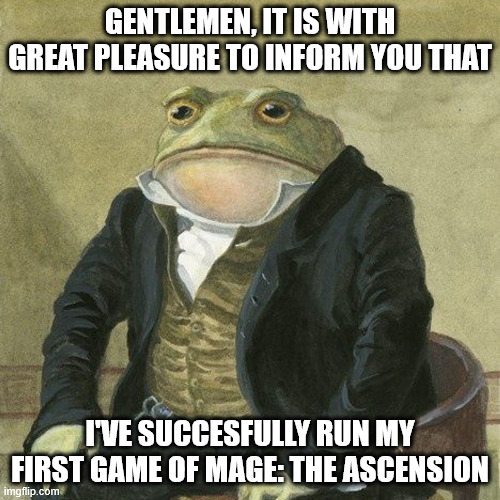 0·2 years agoTwo experienced players, two newcomers, my first tame with the game. It went fine, everyone seemed to have fun. I opted on throwing the players into a more action opening, I was amazed how their own rolls filled in the time to make situation take half of a session and built the tension and pressure by themselves. Did downtime activities, including two starting long term projects, and later threw in some plot hooks. Next session we will begin on selecting next score. We would have done that this time, but my Internet crashed.