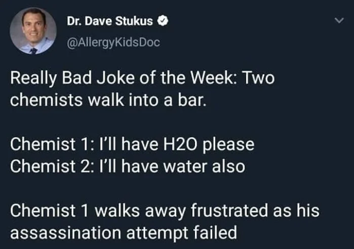 Sjmarf@sh.itjust.works to Science Memes@mander.xyzEnglish · 2 years agoTwo chemists walk into a bar sh.itjust.worksimagemessage-square0linkfedilinkarrow-up10arrow-down10